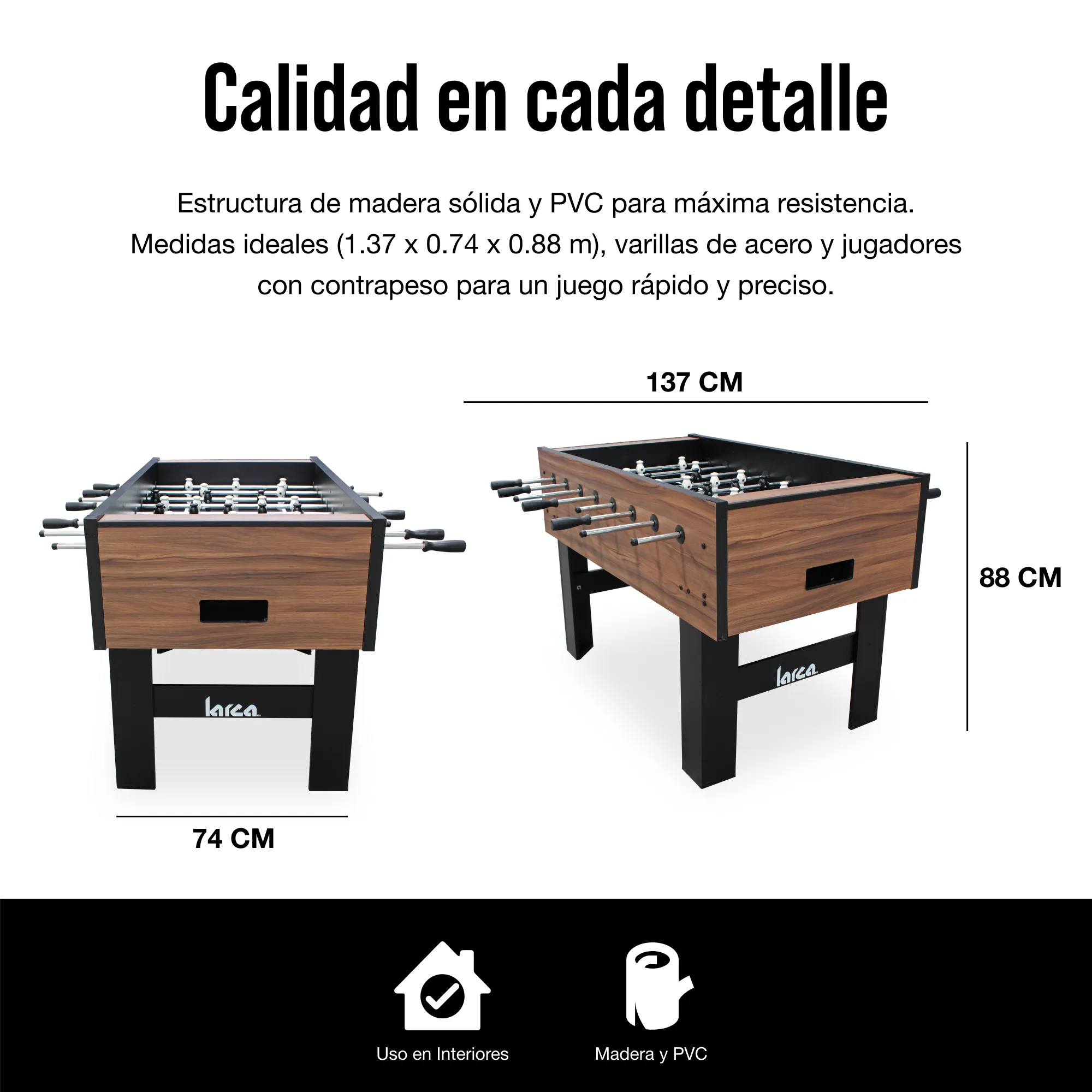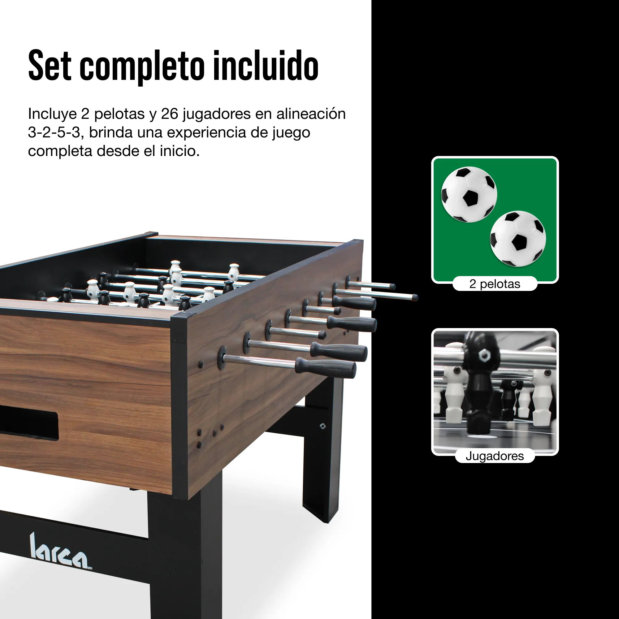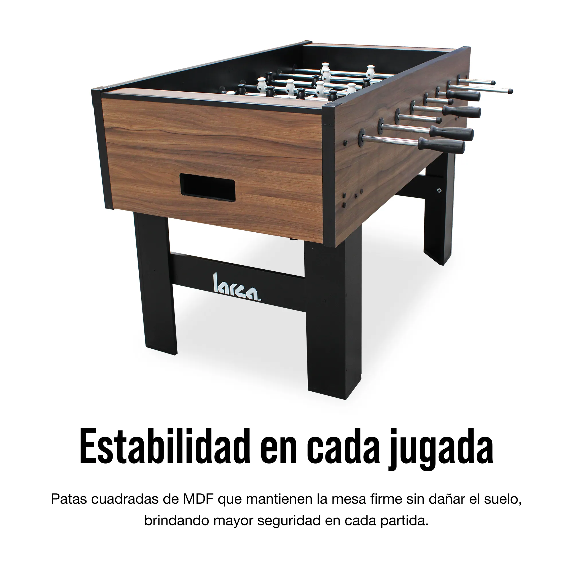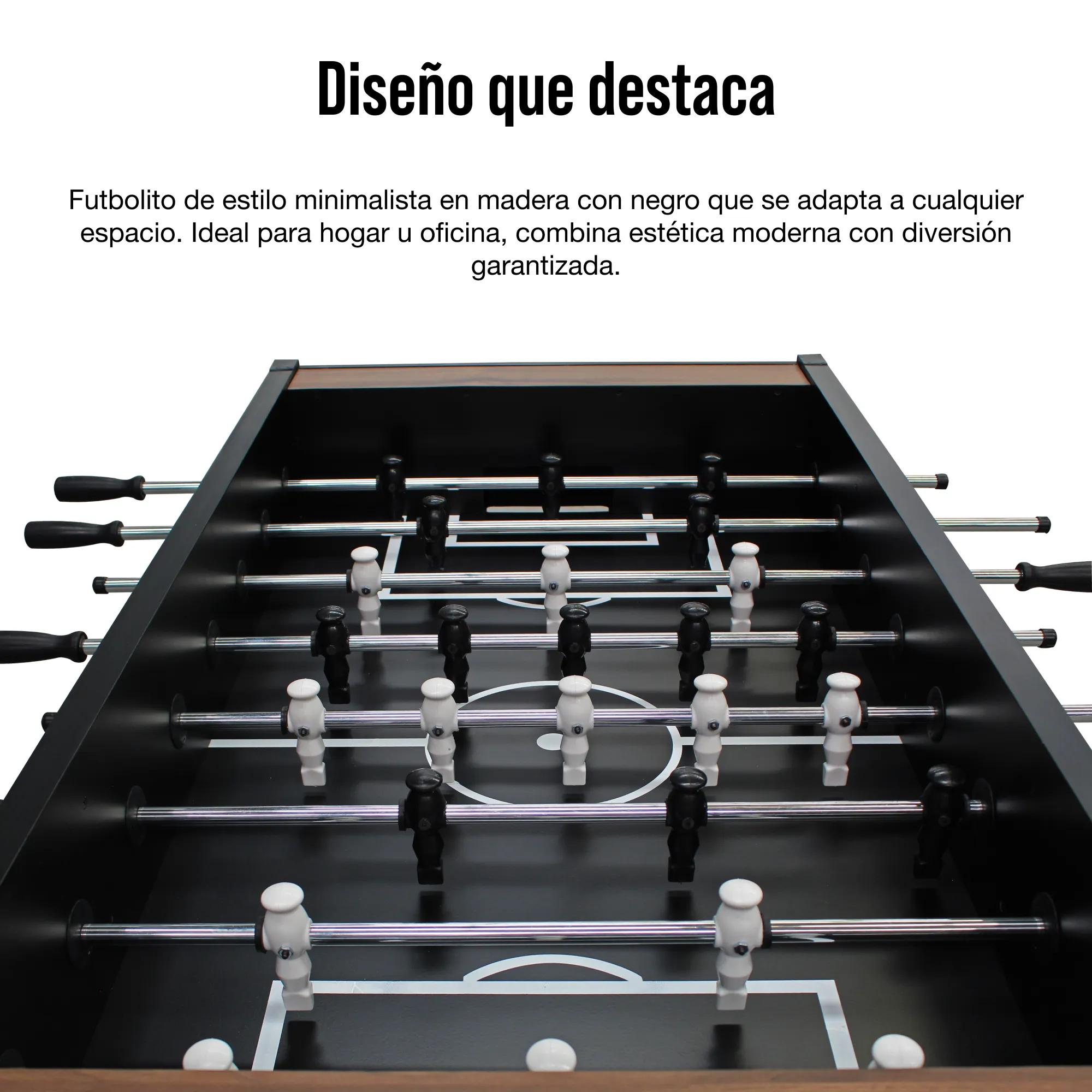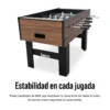 El futbolito Goodkick simula una cancha y juego real con los 22 jugadores, hecho de materiales durables, aplicaciones en PVC y barras metálicas reforzadas, cuenta con gráficos alusivos a soccer, dos portavasos, despachador de pelota y accesorios metálicos.